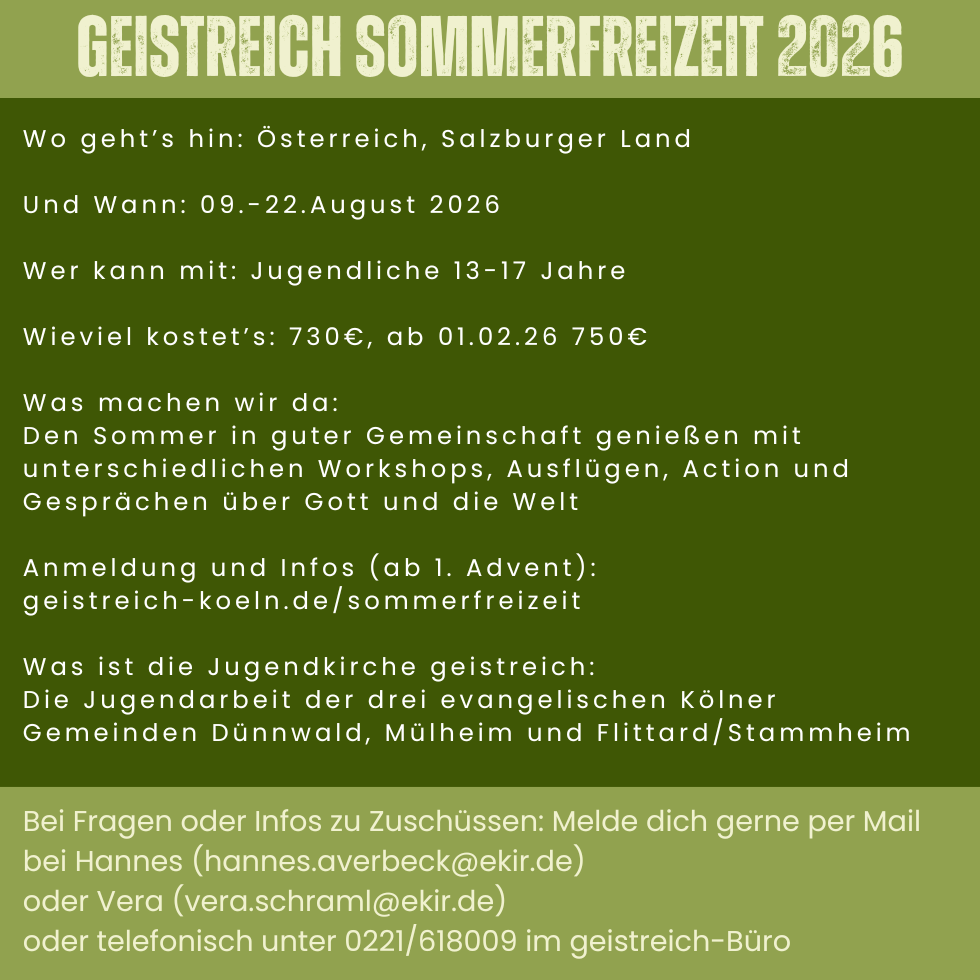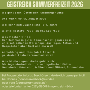 Wenn du Fragen zu der Freizeit hast, melde dich gerne bei Vera oder Hannes im geistreich-Büro unter 0221/618009 oder unter /
